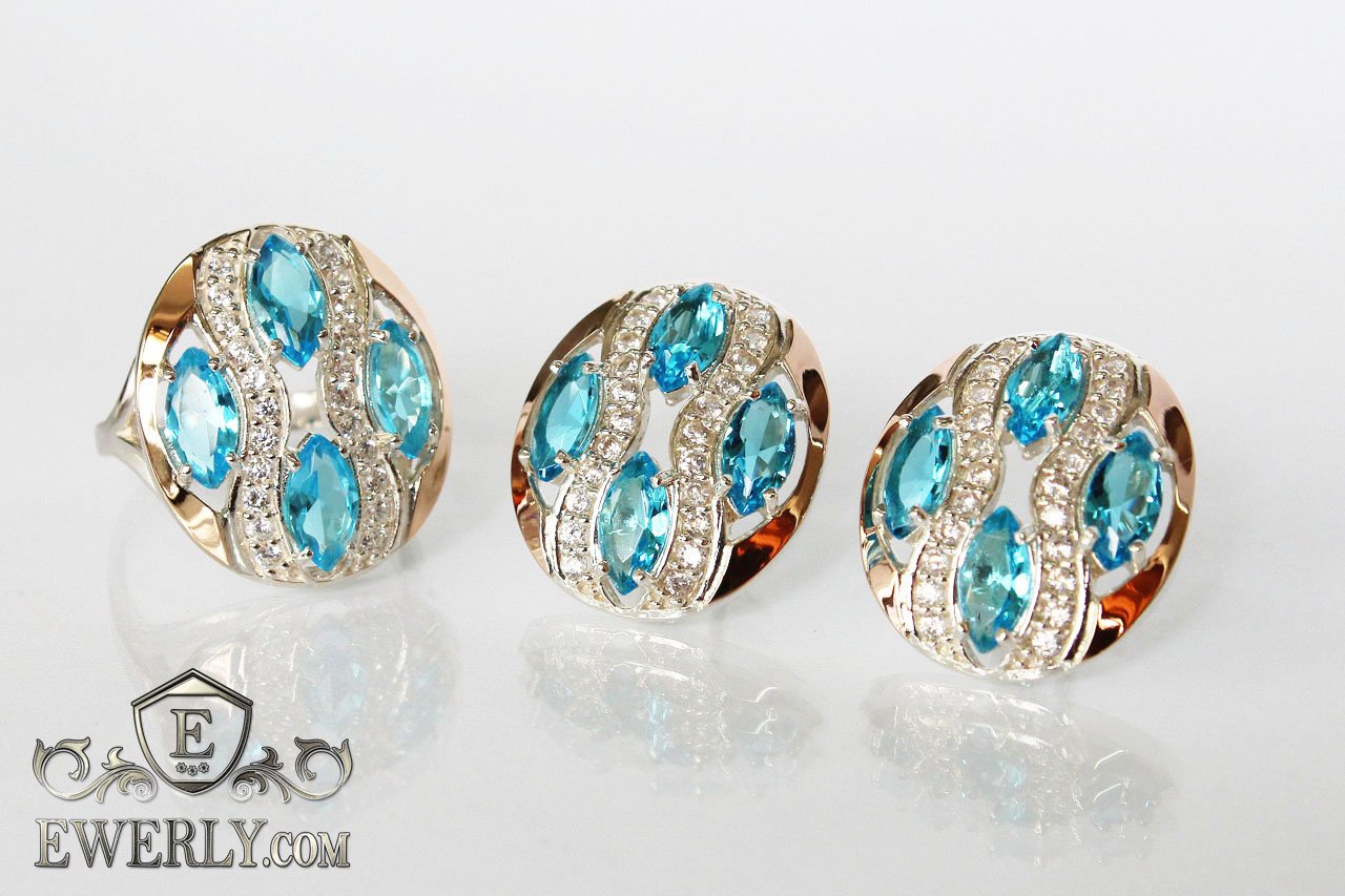 Комплект: серьги и кольцо из серебра с золотом и светло-голубыми камнями