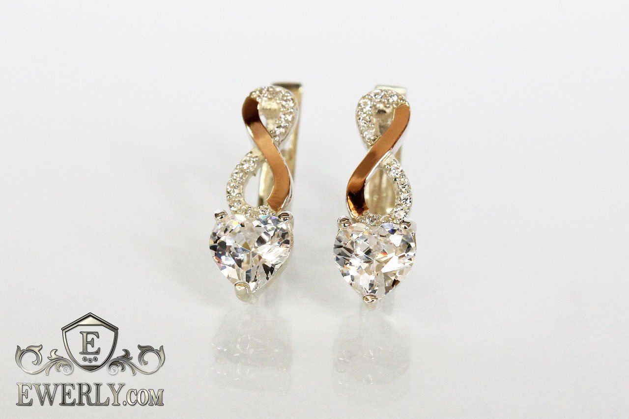 Серебряные серёжки с сердцем и золотом (белый камень)