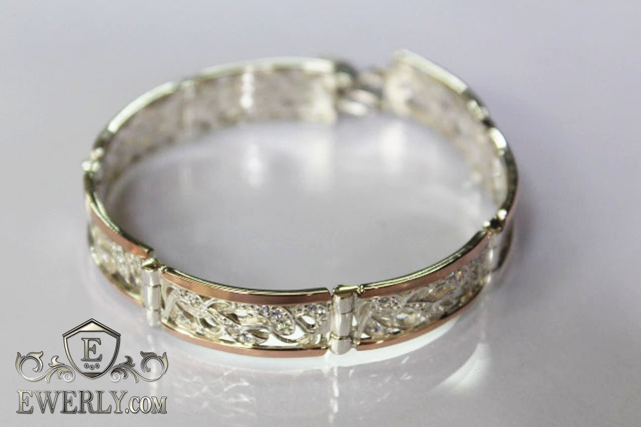 Серебряный браслет женский с золотыми вставками и белыми камнями