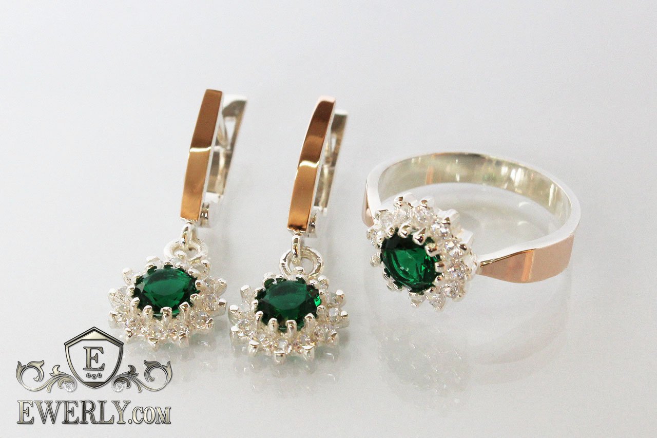 Женский комплект: серебряное кольцо и серёжки с зелёными камнями