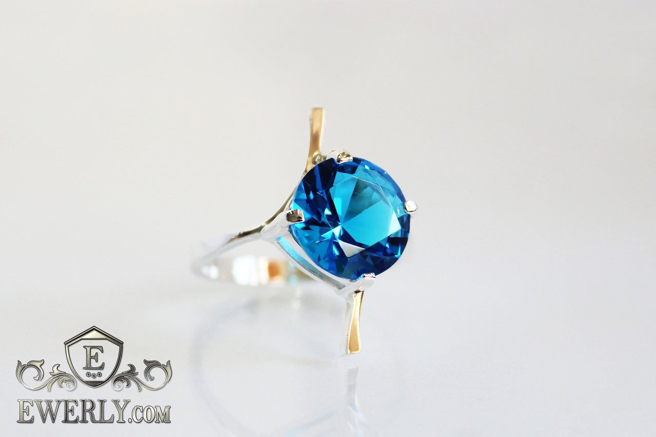 Женское серебряное кольцо 925 пробы с золотыми пластинами 375 пробы с фианитом (синий цвет).