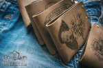 Полностью выполнен из натуральной кожи и металлических заклепок. Эксклюзивное изделие ручной работы, имеет эффект потёртости и лёгкой небрежности. Рисунок нанесён на кожу с помощью лазера (лазерная гравировка). Изготовлен в ограниченном выпуске.