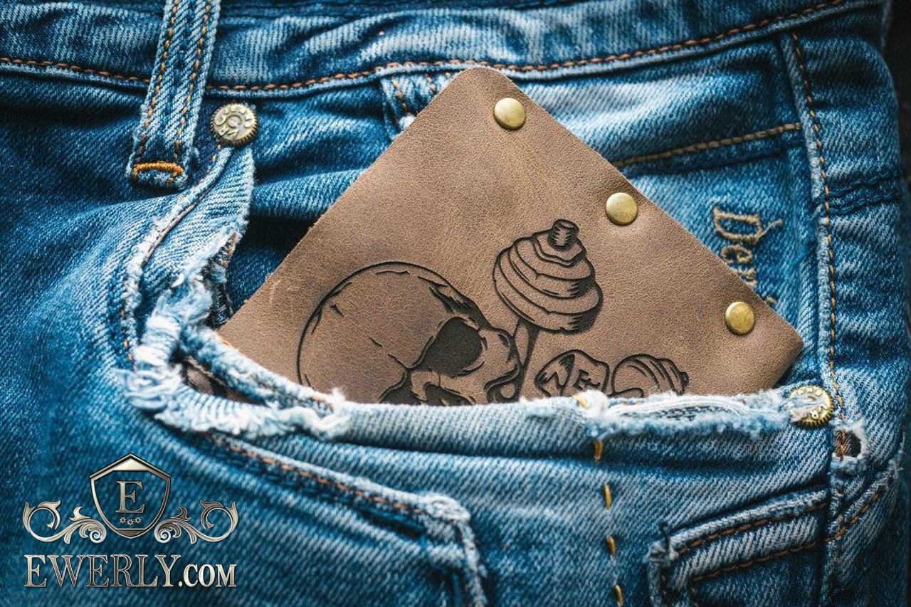 Кожаный кошелек для мужчины с изображением черепа и штанг