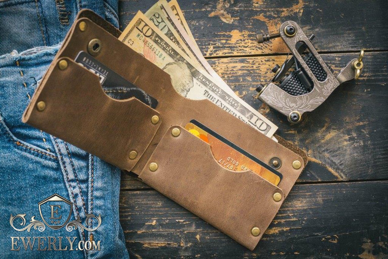 Бумажник имеет одно отделение под купюры всех номиналов и два отделения для банковских карт / визиток. Всего вмещается 4-6 карт в зависимости от их толщины, закрывается кошелёк с помощью двух кнопок изнутри.