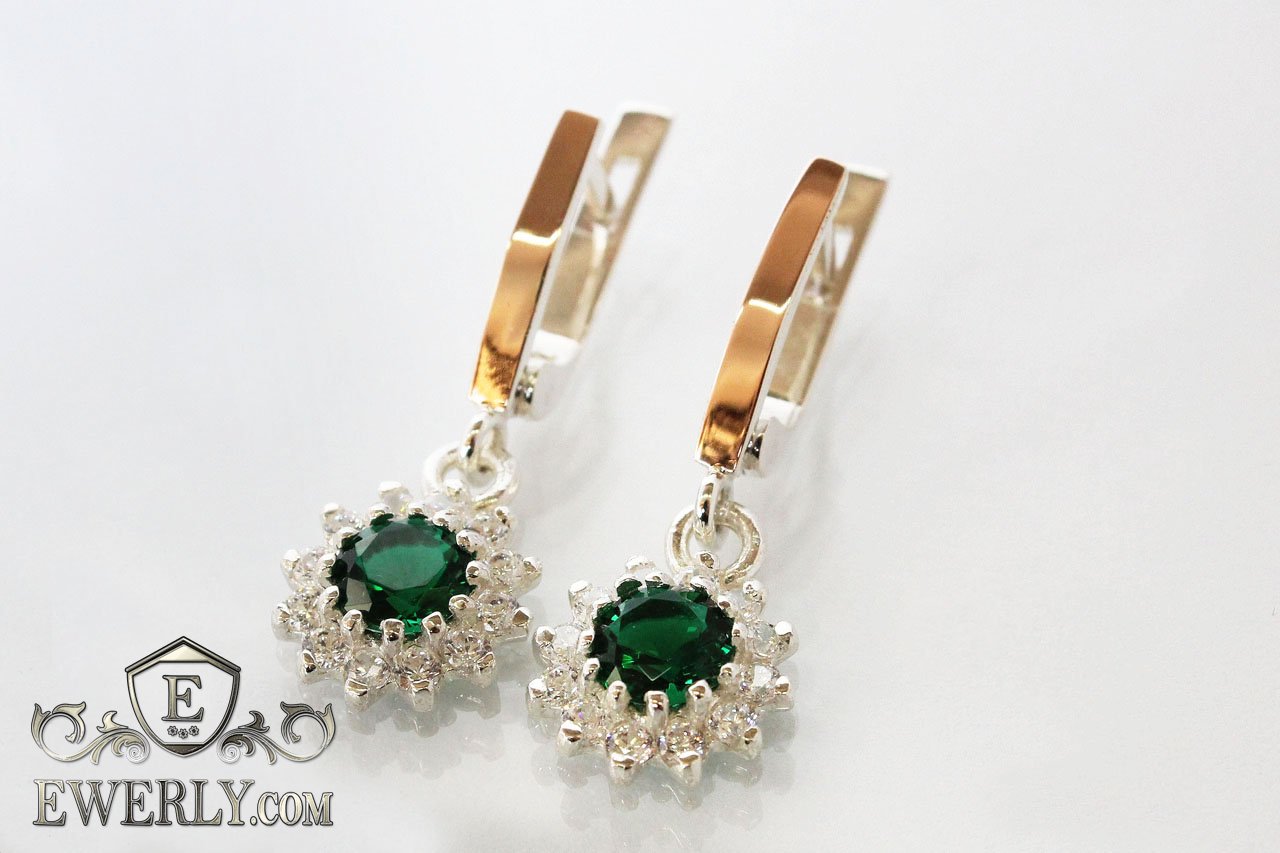 Серёжки из серебра с зелёными камнями для девушки (золотые вставки)